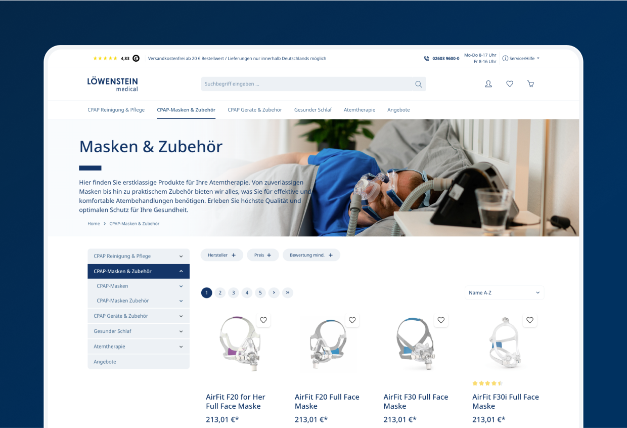 To improve the usability and conversion rate in Löwenstein Medical's online store, we integrated a cross-selling logic that shows customers related product recommendations under “Matching accessories”. Reviews were also integrated to increase trust and make the purchase decision easier. For optimal performance, we also carried out a pagespeed optimization, which significantly improved the store's loading times. In addition, our hosting and service level agreement ensures a stable, reliable and secure store environment that runs smoothly at all times.